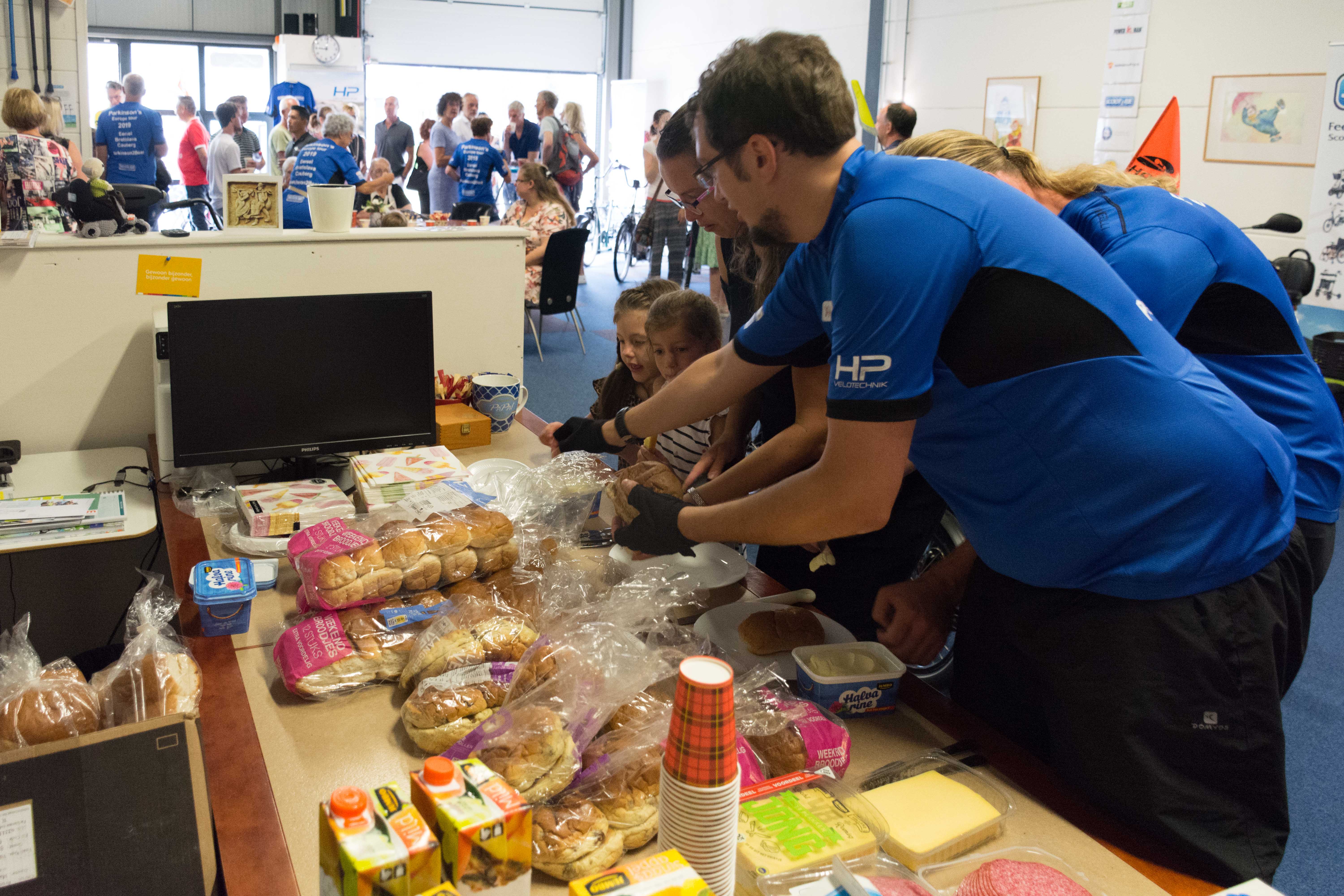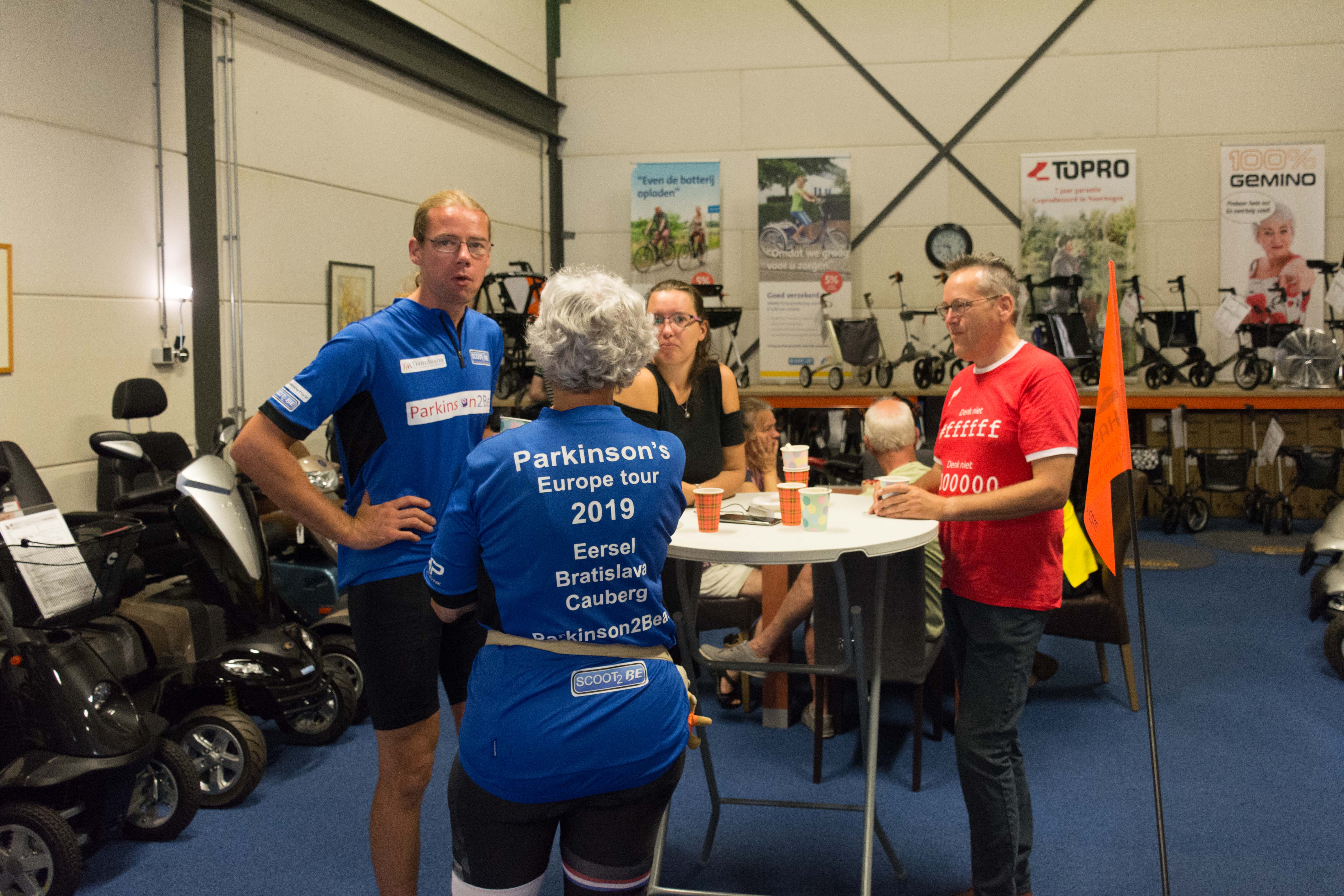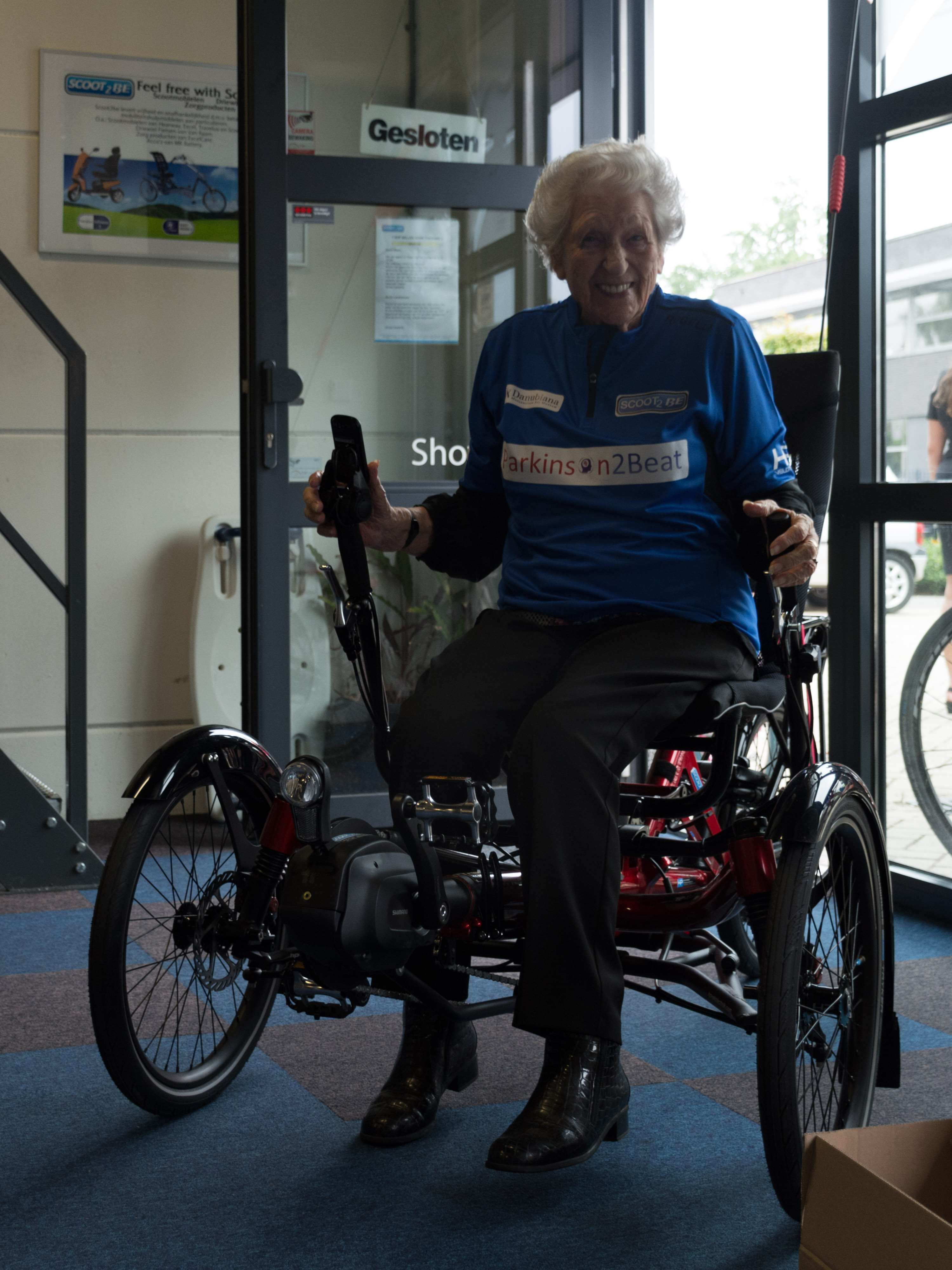 De volgende ochtend was er bij Scoot2Be in Eersel een uitzwaai-ontbijt. En hier kreeg ik mijn fiets voor die dag. Zoals je op de groepfoto kunt zien, is de zit wat hoger, wat het instappen een stuk makkelijker maakt.  Dat bewees de 97-jarige moeder van Tirza die ook even op de fiets klom. En natuurlijk sponsor je door iets  te kopen. Een Parkinson tulp op de fiets.