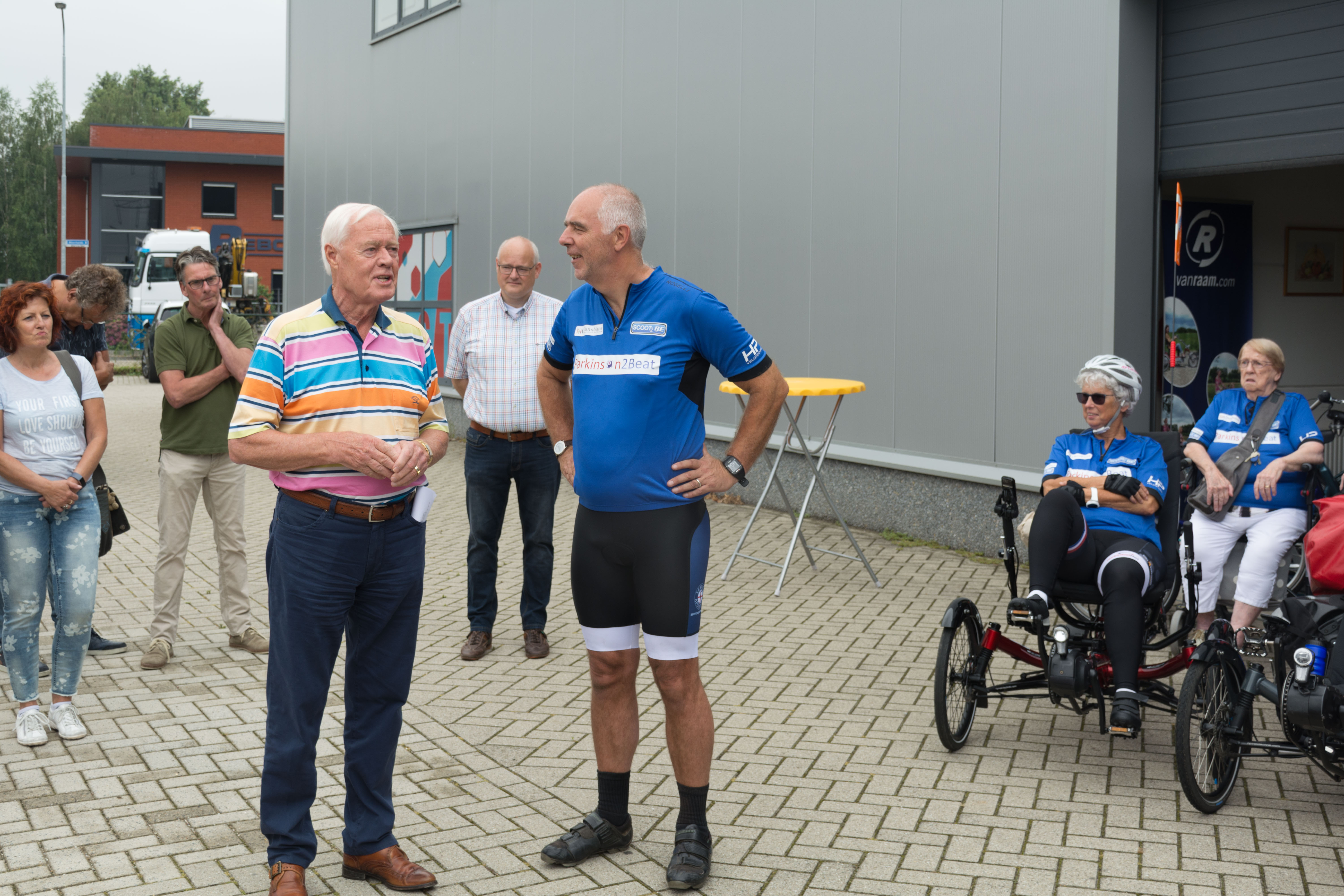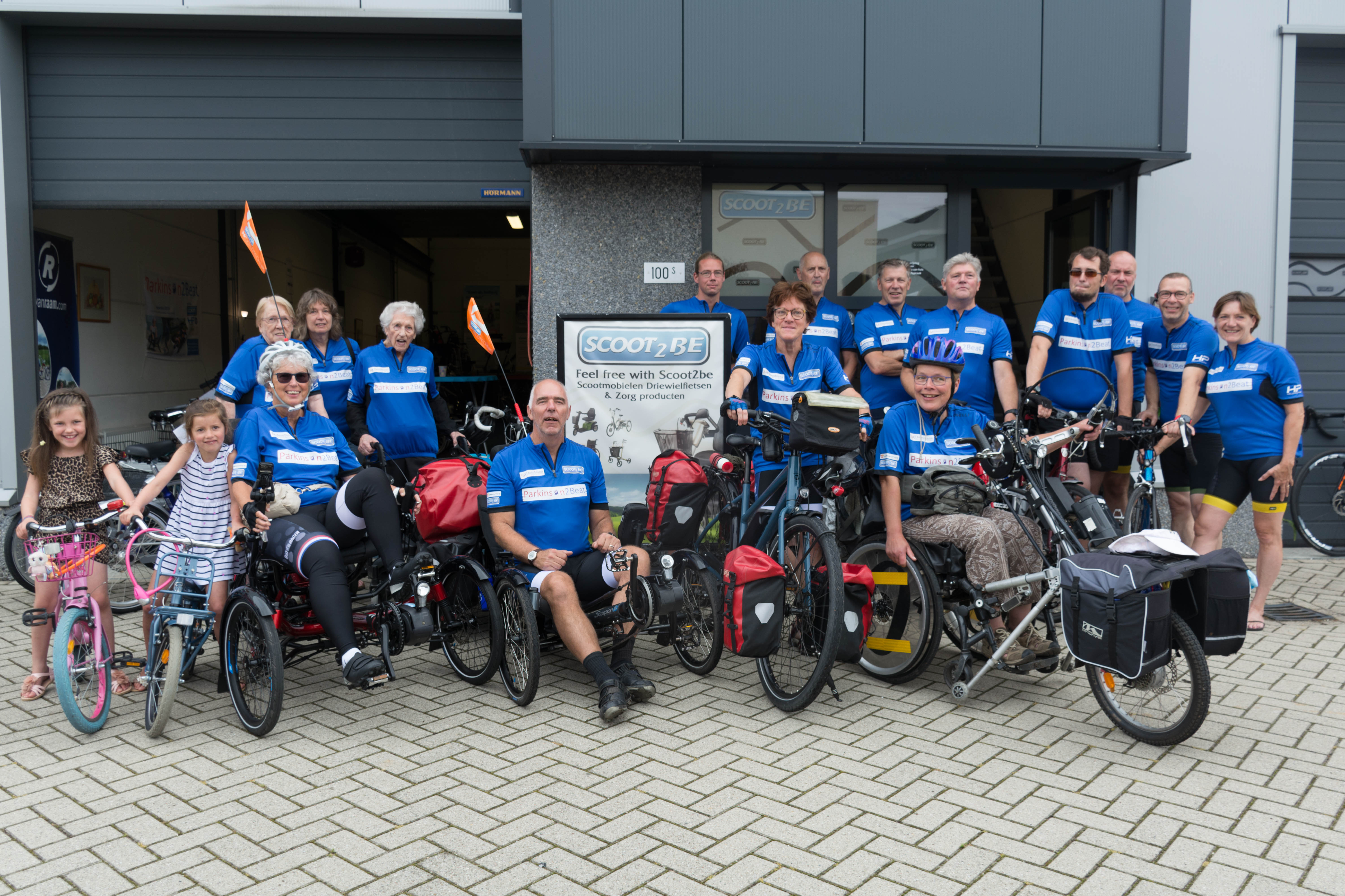 Om 10:00 uur waren er enkele praatjes van o.a. Ruud Overes, Paul van Vroenhoven van Scoot2Be, Gerard Meulensteen, en wethouder Steven Kraaijeveld,. En hierna nog de persfoto’s en dan is het zo ver, eindelijk het echte vertrek. Ruud, Adorien en ik zou het eerste stukje vergezeld worden door mijn kleinkinderen, tot Weert door Barbara met haar handbike, en tot Viersen door een fietsploeg waaronder mijn zoon en schoonzoon.