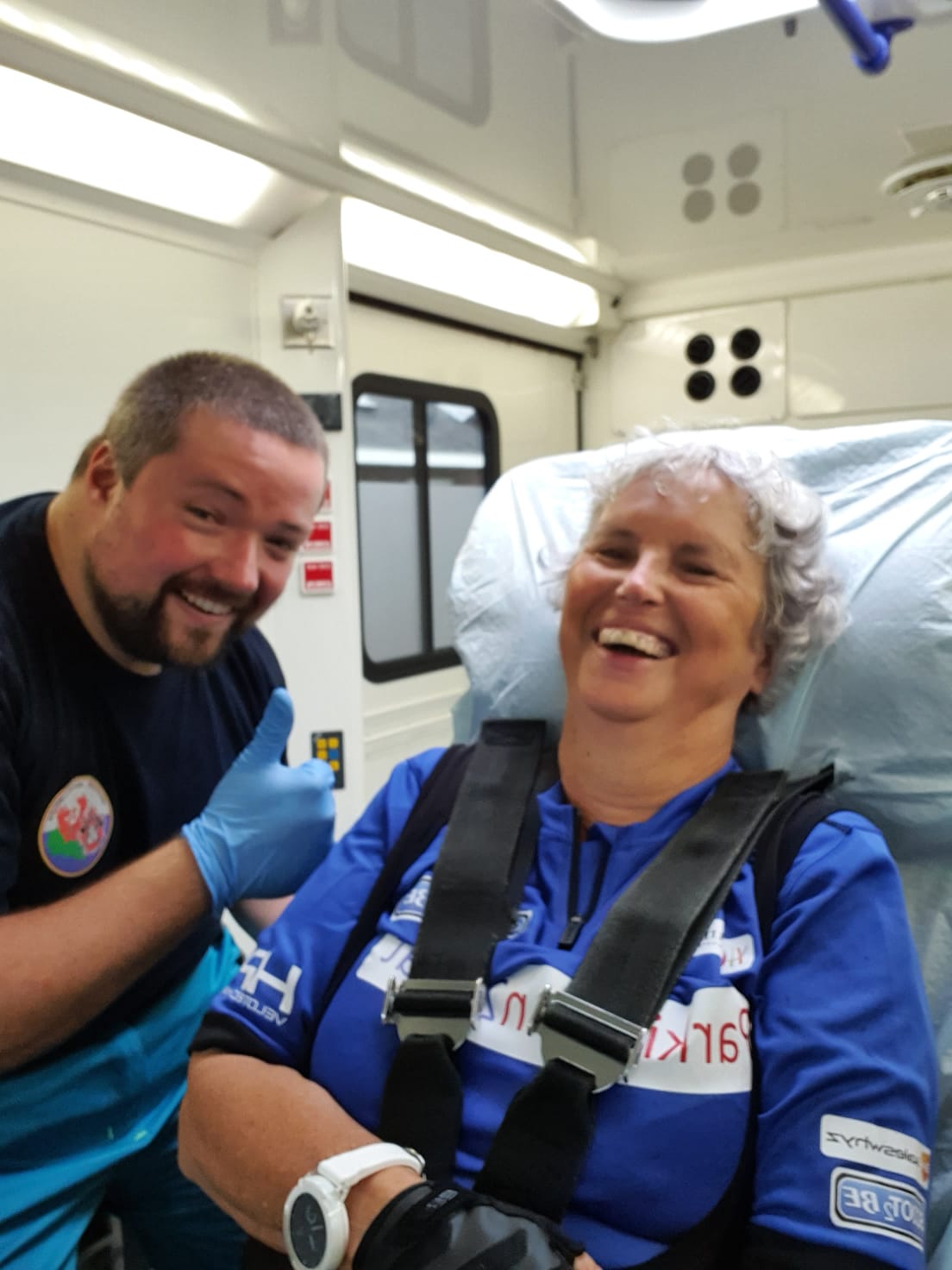 Nu bleek ik toch weer eens geluk te hebben; doordat we de andere fietsers net voorbij waren, was er snel hulp. De bus van Scoot2Be en Paulus werden gebeld. Mijn rechter arm en hand deden pijn en bloedden behoorlijk en ook op de heup was bloed te zien. Voor alle zekerheid werd een ambulance gebeld. De ambulancebroeder gaf aan dat ik de derde Nederlander was die met de fiets onderuit was gegaan. Ik had geen pijn in mijn heup maar er zat wel bloed dus men wilde mij toch meenemen en de vinger moest in elk geval worden gehecht. Later bleek mijn hele onderbroek onder het bloed te zitten, allemaal door de snee in de in mijn vinger.