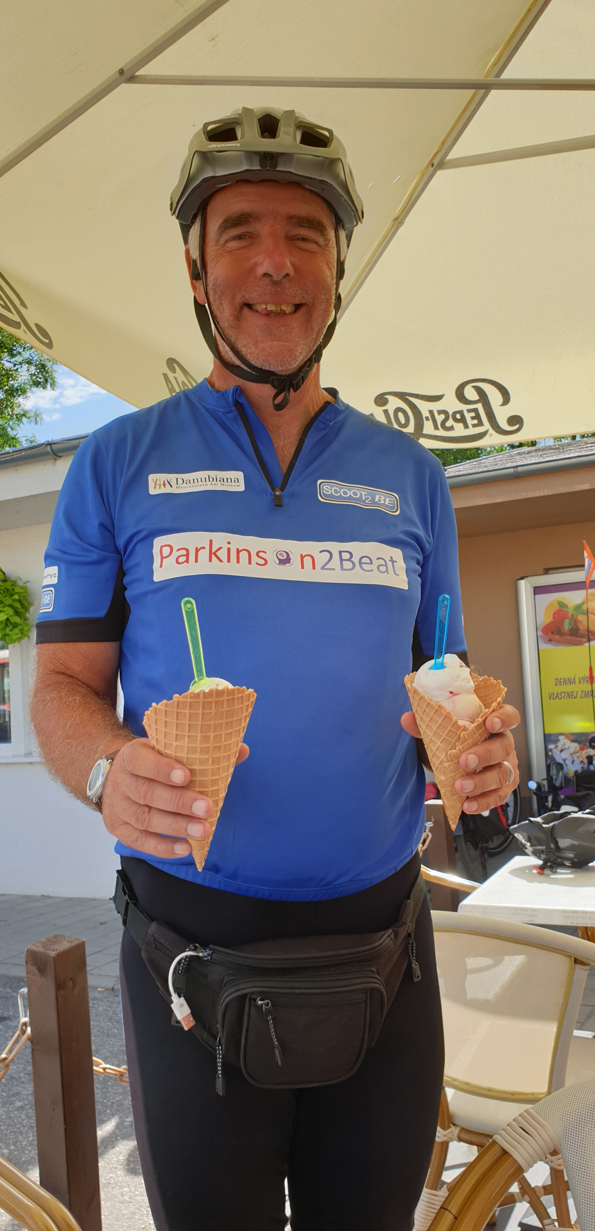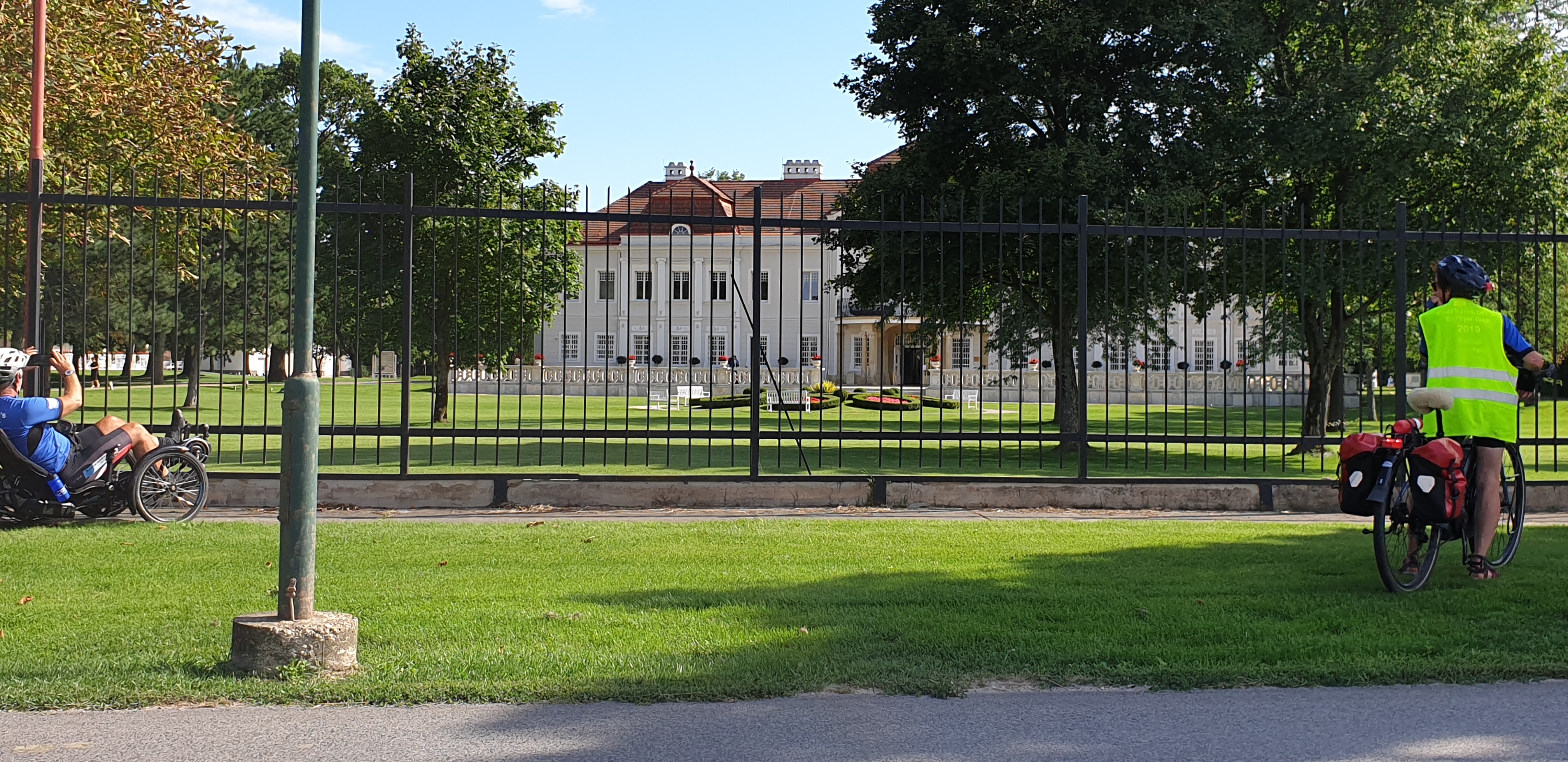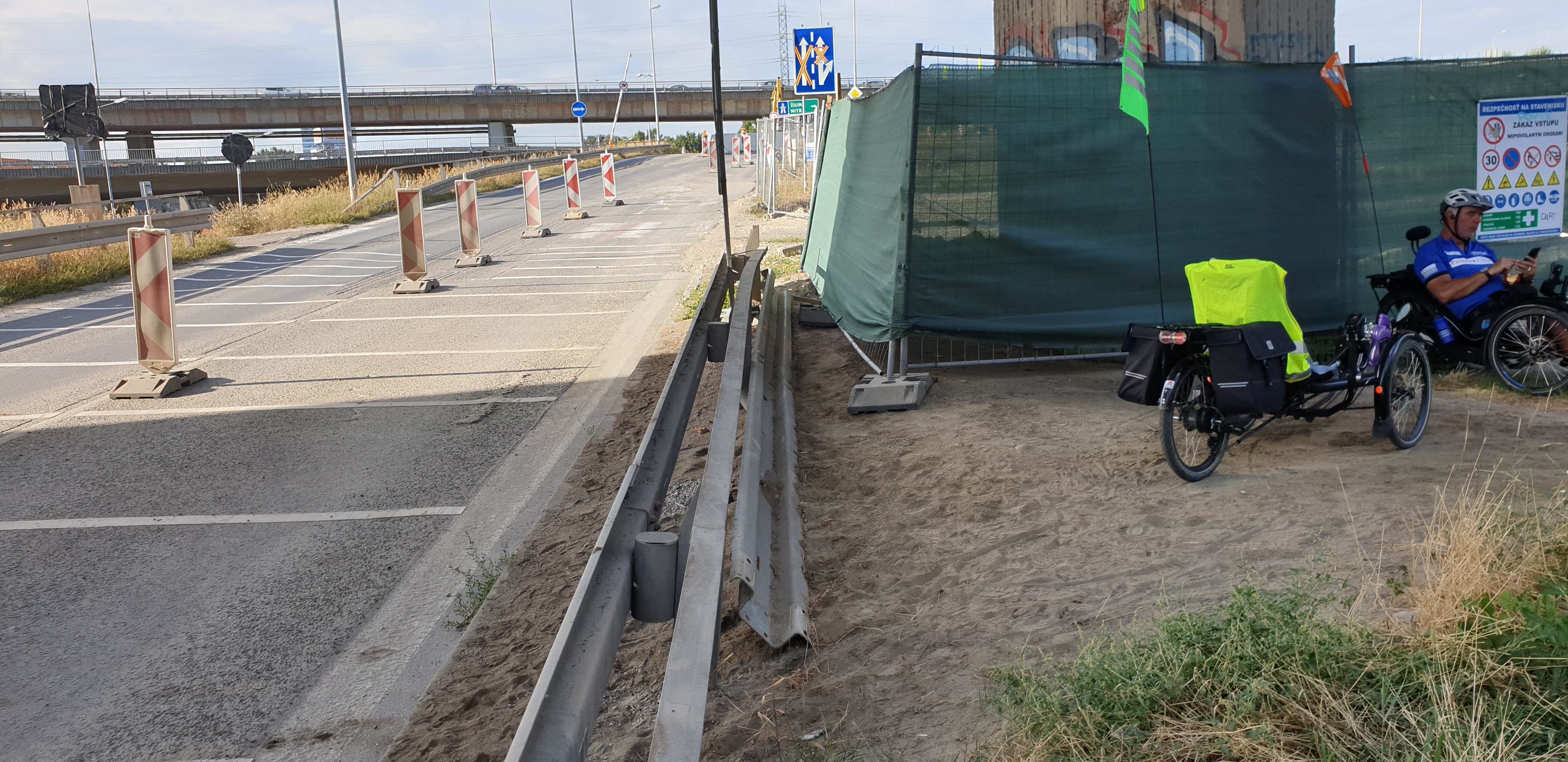 En ja, ik heb ook nog een foto gemaakt van Ruud die liefst elke dag een ijsje wil, en een paar foto’s van onderweg en natuurlijk eentje van de aankomst in Bratislava. En ik kon het ook niet laten om een foto te maken van een fietspad dat ophoudt en aan de overkant weer verder gaat, maar waar je wel de weg over moet steken en dan je fiets, in dit geval onze trikes, over een vangrail moest tillen.